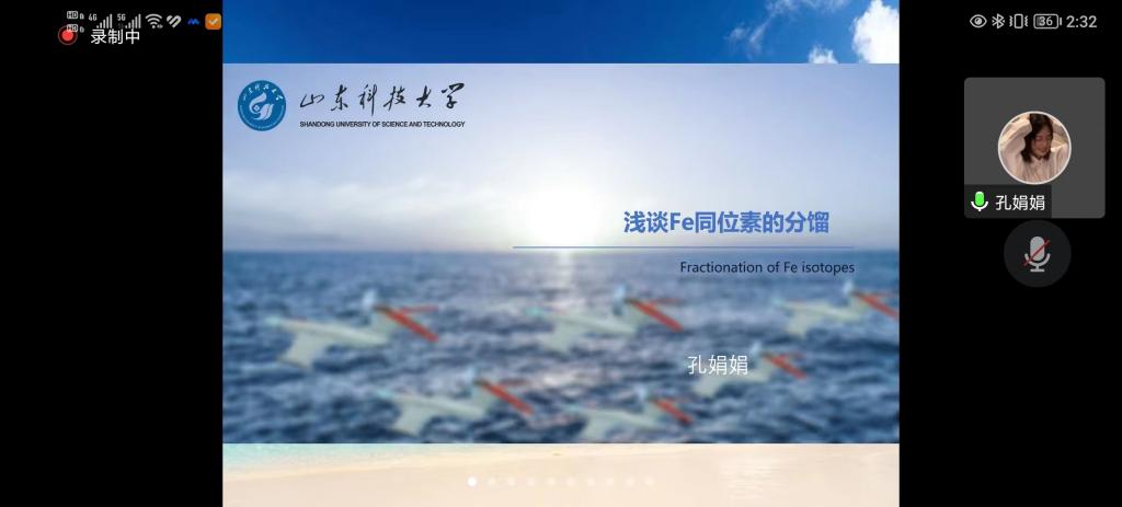 2022年11月6日下午,今年会jinnian官网第四期海洋论坛活动在线上举行,本次活动邀请来自山东科技大学孔娟娟博士为今年会官网师生做了题为《浅谈Fe同位素分馏》的学术报告。会议由海洋生物资源教学部马瑶博士主持,学院党委副书记、副院长孙胜显出席会议。参会成员为海洋资源与环境专业全体师生。