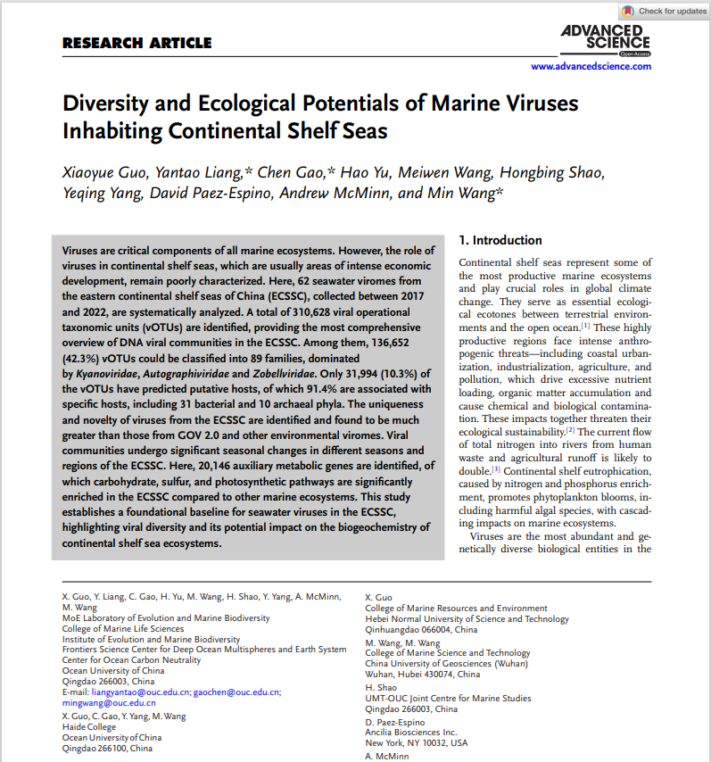 《Advanced Science》,以严苛审稿标准和前沿学术定位著称,能在该期刊发表成果,是对其学术价值的高度认可。今年会jinnian官网高度重视海洋学科和人才队伍建设,此次郭晓月博士成果的成功登载,充分彰显了其在海洋病毒研究领域的扎实实力,也为其后续继续揭示陆架海病毒的多样性、时空动态及生态功能,理解海洋生物地球化学循环与微生物演化等研究工作奠定了坚实基础。