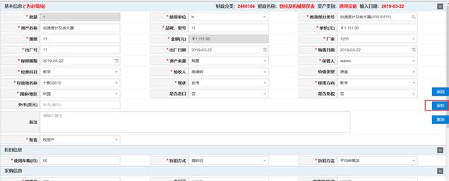 选择资产登记类型:固定资产、低值耐用品,再选择需要录入的资产卡片,资产卡片填写完整后,点击“保存”按钮。