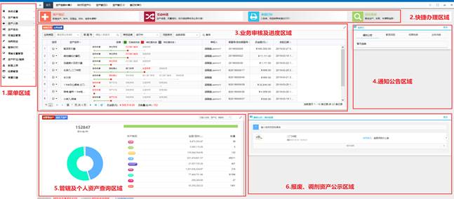 用户可对“资产登记”、“资产变动(含调拨、调剂、处置等)”、“单据打印”及“综合查询”等功能在首页快捷办理区域直接点击办理,无须查询左侧菜单。