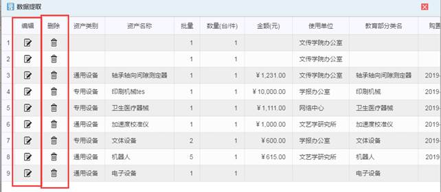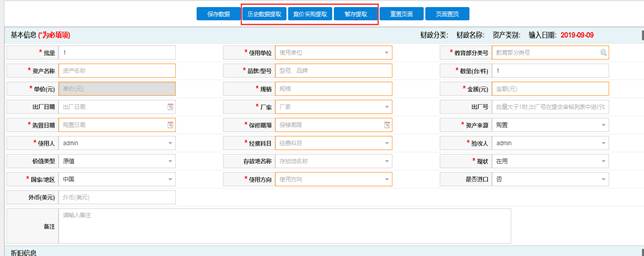 ④【历史数据提取】:可以提取在账资产数据至当前要录入资产的页面上,老师可以在此基础上进行修改使其变为当前要录入的资产,然后保存提交;