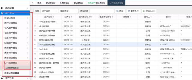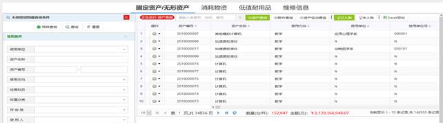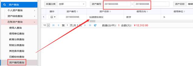 该功能可查询全校资产信息,但最后查询的结果,只能说明本单位是否有此类资产,不能说明本单位实际资产情况。查询时,您可以以分类号、资产名称、型号、规格、购置日期或其他条件定位,找到要查询的资产部分字段信息。