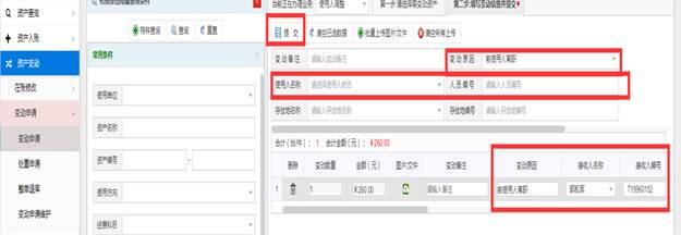 3.如图,先填写必填信息变动原因及调拨使用人名称,然后点击提交,并提交审核。