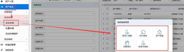 操作菜单为:首页【变动申请】快捷菜单或左侧【资产变动】→【变动申请】→【使用人调整、校内调拨和闲置调剂】菜单。
