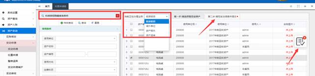 以【使用人调整】为例,点击【使用人调整】,显示下图的界面,您可通过【查询条件】筛选出要调整的数据信息,勾选后,填写变动信息并必须【提交】,再由上级资产管理员进行审核。